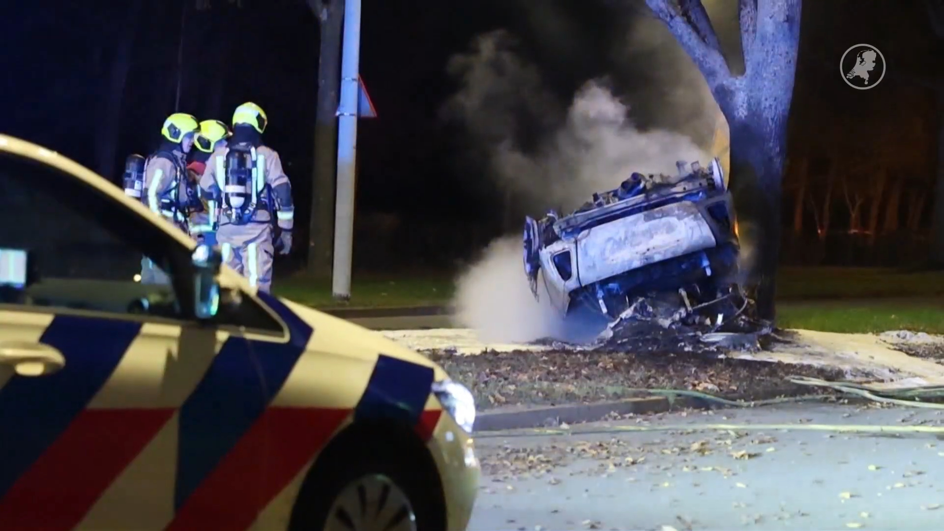 Volgens ooggetuigen reed de auto met hoge snelheid door woonstraten, waarbij andere weggebruikers wanhopig probeerden uit te wijken. “Het ging allemaal zo snel, de lichten, de sirenes, en toen hoorde je een enorme klap,” vertelde een buurtbewoner aan de lokale pers. Minuten later sloegen vlammen uit het voertuig toen het tot stilstand kwam tegen een boom op de Bezuidenhoutseweg. De impact was zo krachtig dat de auto volledig in brand vloog, waardoor onmiddellijke hulpverlening nodig was.