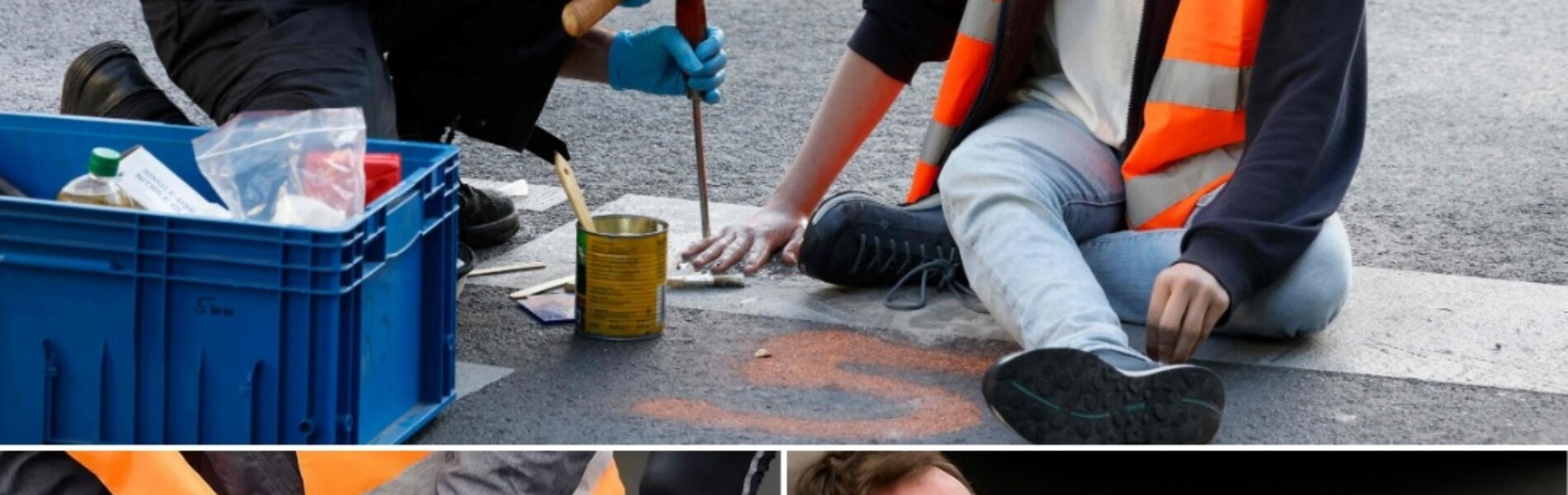 Een klimaatactivist besloot zijn hand niet zomaar met lijm aan het asfalt te plakken, maar het nog heftiger te maken door een mengsel van superlijm en zand te gebruiken. Hierdoor zat de huid letterlijk vast in een cementachtige massa.