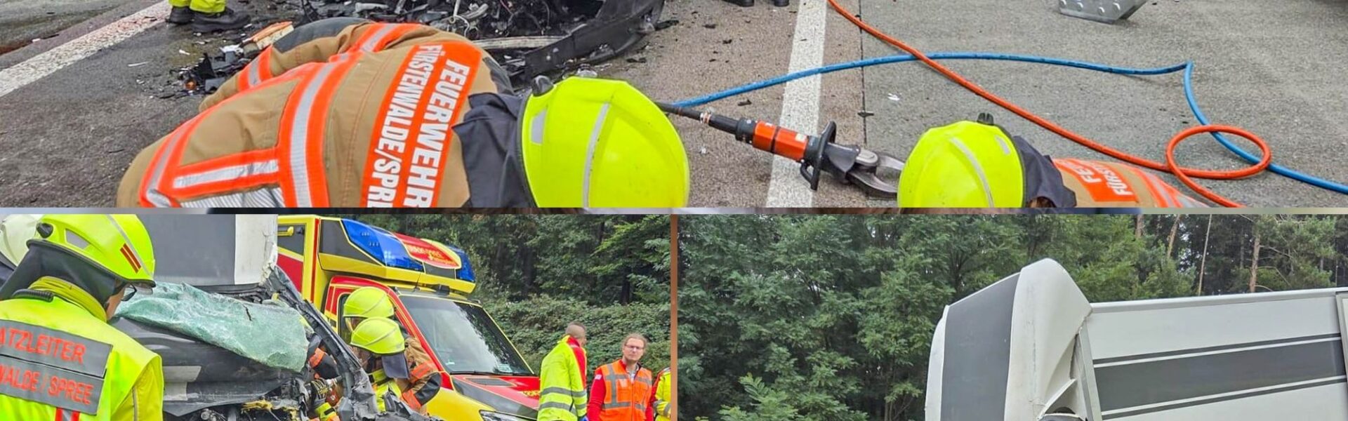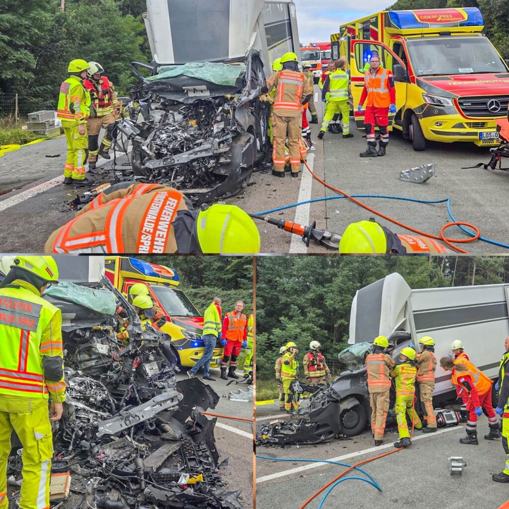 Für die Dauer der Rettungs- und Bergungsmaßnahmen wurde die Richtungsfahrbahn voll gesperrt. Die Polizei hat die Ermittlungen aufgenommen. (Fotos: Feuerwehr Fürstenwalde/Spree)