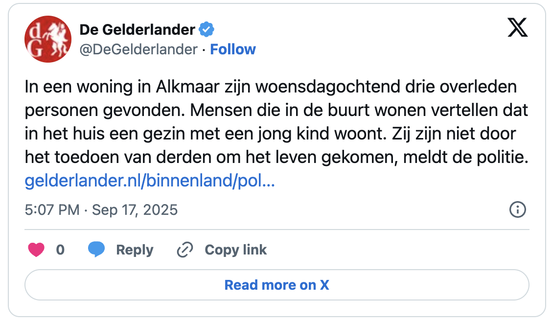 Schokkend nieuws uit Alkmaar: drie leden van een gezin, inclusief een 3-jarig kindje, dood aangetroffen in huis