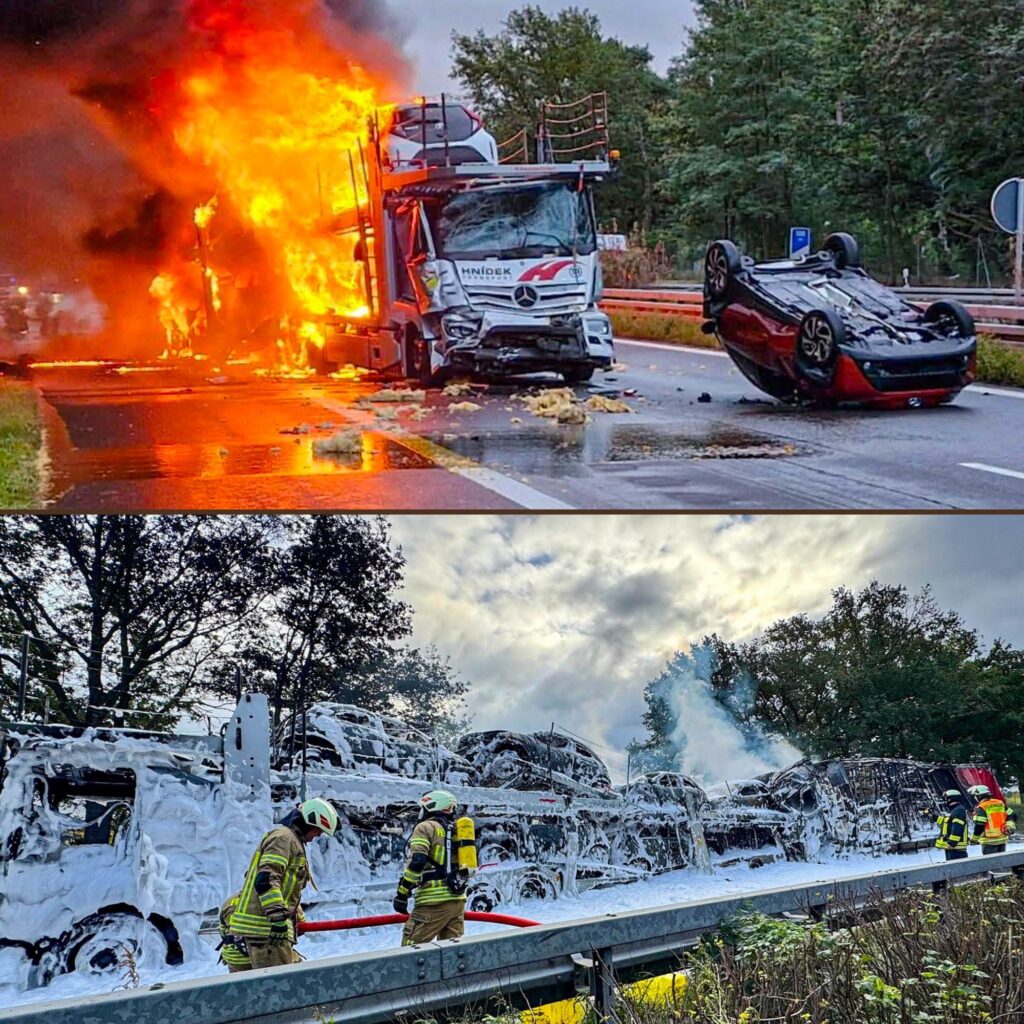 Ein Autotransporter, beladen mit Elektrofahrzeugen, geriet dabei in Brand. Aus einem weiteren Lkw trat eine größere Menge Speiseöl aus, was die Löscharbeiten erheblich erschwerte und zu Beschädigungen der Fahrbahn führte. Das Feuer griff anschließend auf den hinteren Lkw über.