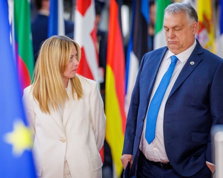 Giorgia Meloni, the Italian prime minister, and Viktor Orbán, the Hungarian leader, at an EU summit in Brussels on 19 March 2026. Photograph: Olivier Matthys/EPA